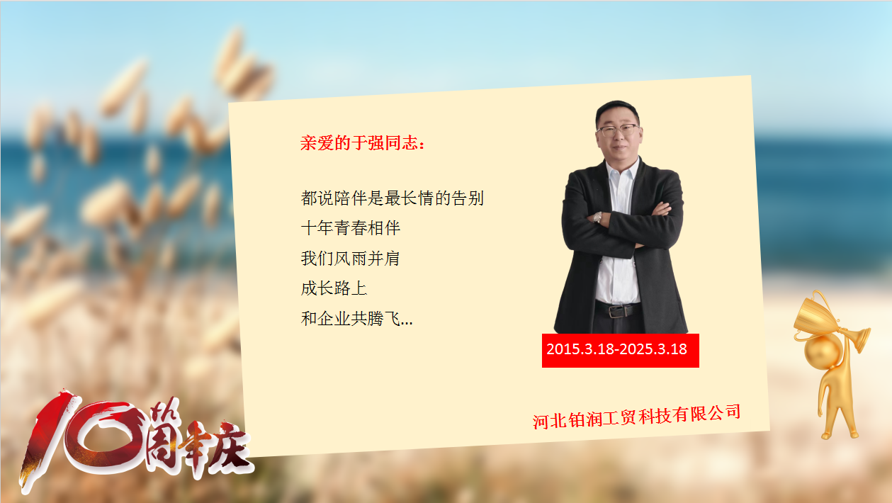 河北铂润董事长李总也上台表达了对他们的感谢与肯定,高度赞扬了他们十年来为公司做出的贡献,与公司共同迈向更辉煌的未来。