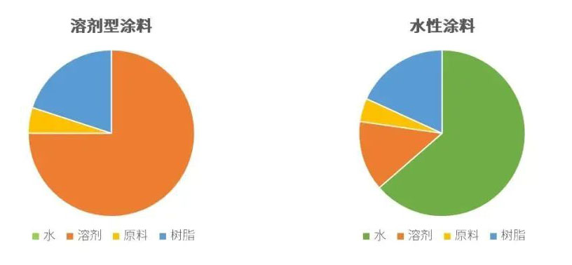 这幅图片我们不难发现水性涂料的独特之处——其挥发性有机化合物(VOC)含量偏低,而水分则占据了较高的比例。这一特性直接导致了水性涂料在施工与干燥过程中,对周遭环境的温湿度变化的要求。为了确保施工效果与质量的稳定,确保温湿度处于适宜范围,是保障水性涂料施工质量的关键所在。